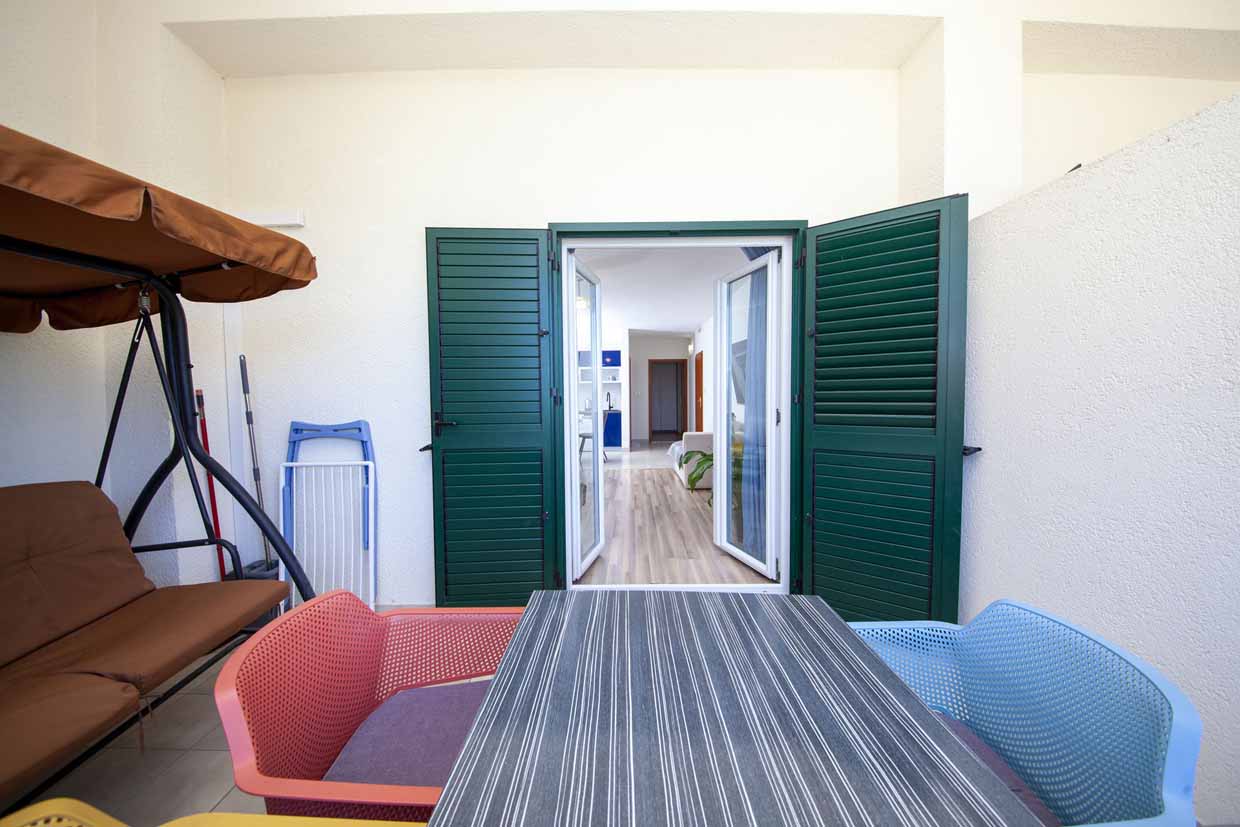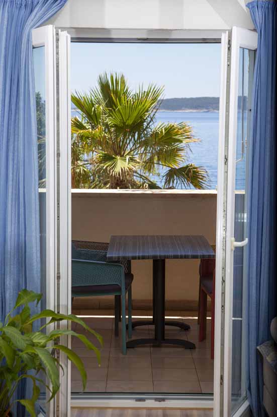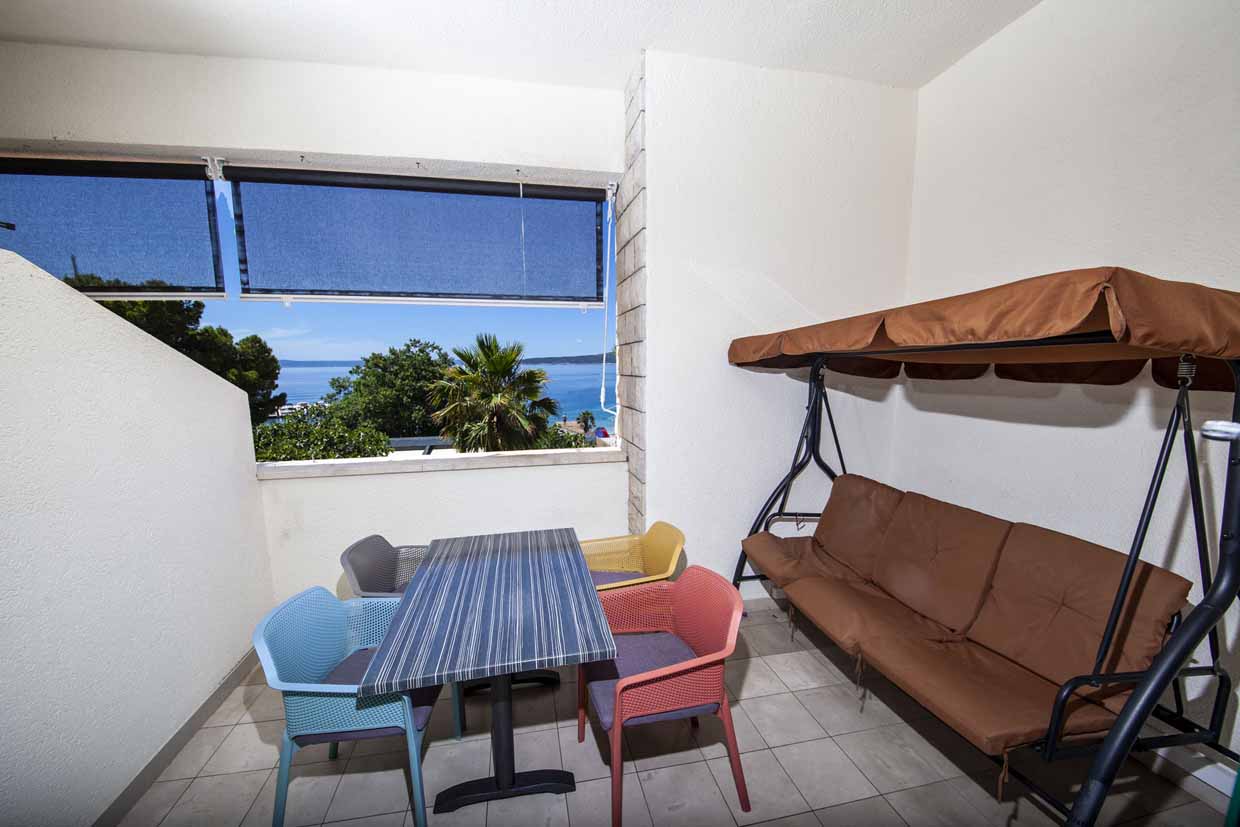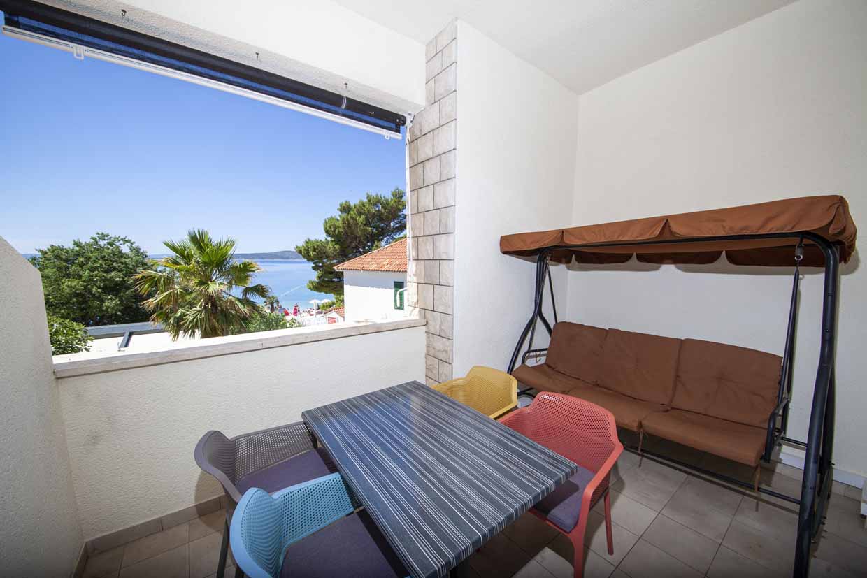 - BALKON: Natkriveni balkon s vrtnom garniturom, ležaljka, pogled na more.